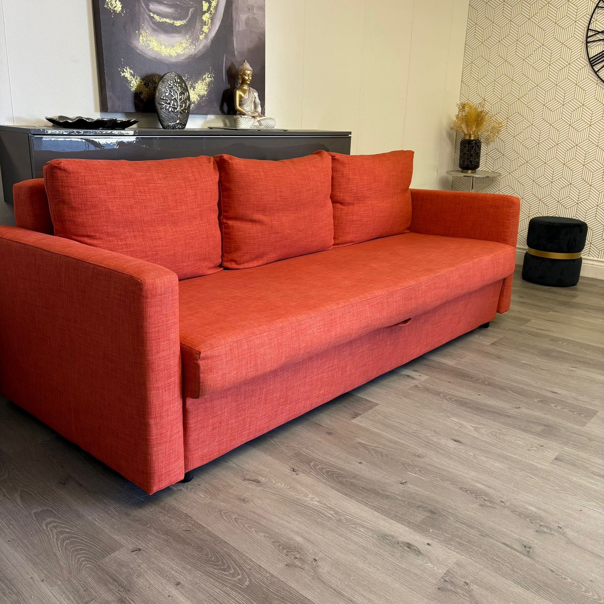 Canapé-lit IKEA Friheten 3 places de couleur orange, en bon état général à l’exception d’une petite tâche d’usure comme montré sur les photos. Ce modèle est à la fois pratique et confortable, avec un espace de rangement intégré et une fonction lit facile à déplier. Parfait pour un intérieur dynamique et chaleureux. Le canapé a été soigneusement nettoyé et stérilisé en profondeur pour garantir une hygiène optimale.