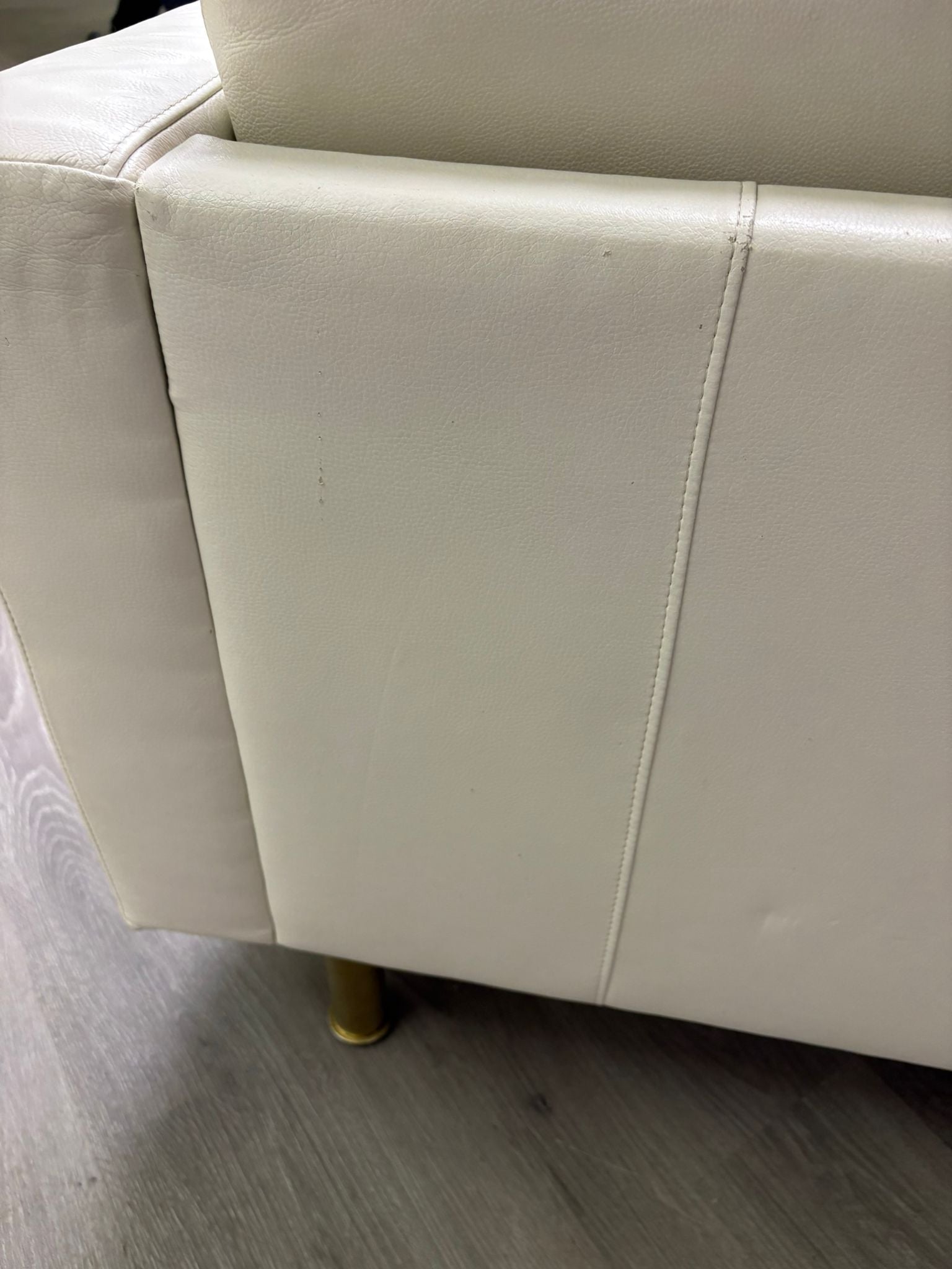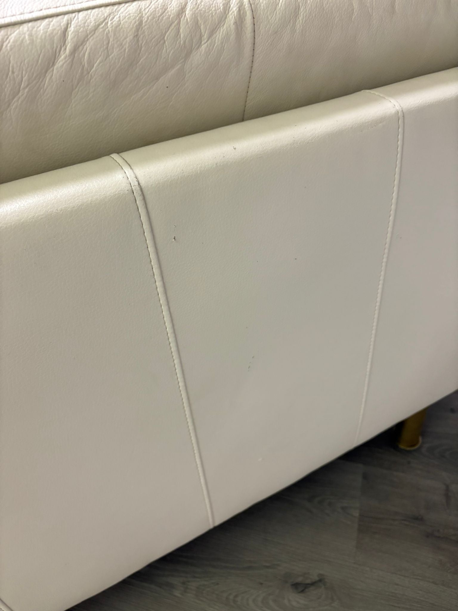 Canapé Morabo deux places en cuir beige, au design élégant et intemporel. Son assise capitonnée et sa forme droite offrent un confort ferme et équilibré, tandis que ses pieds métalliques dorés apportent une touche moderne et chic à votre salon.