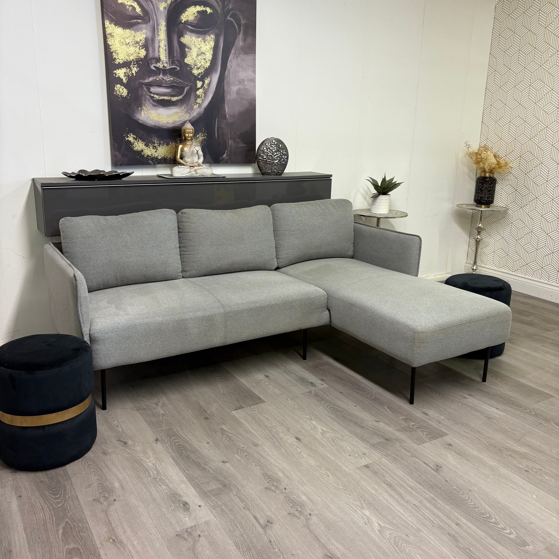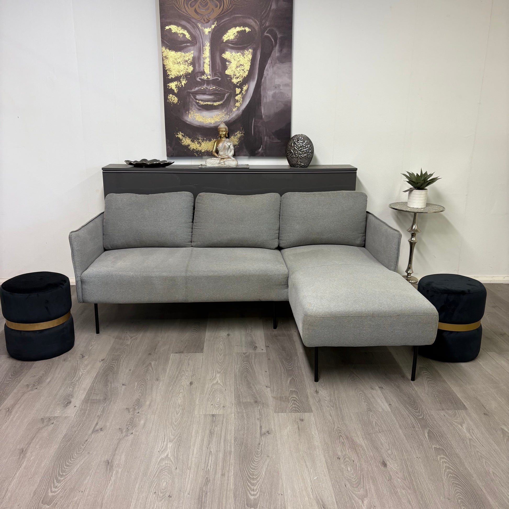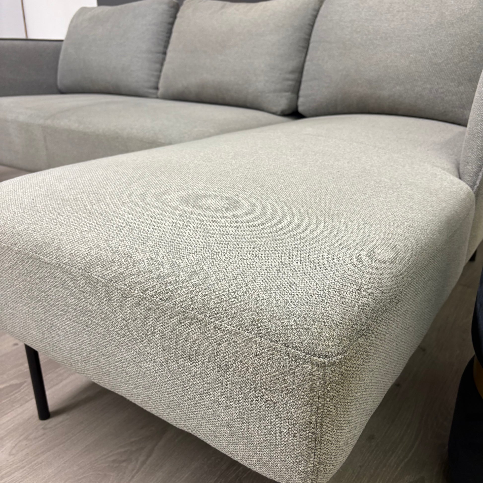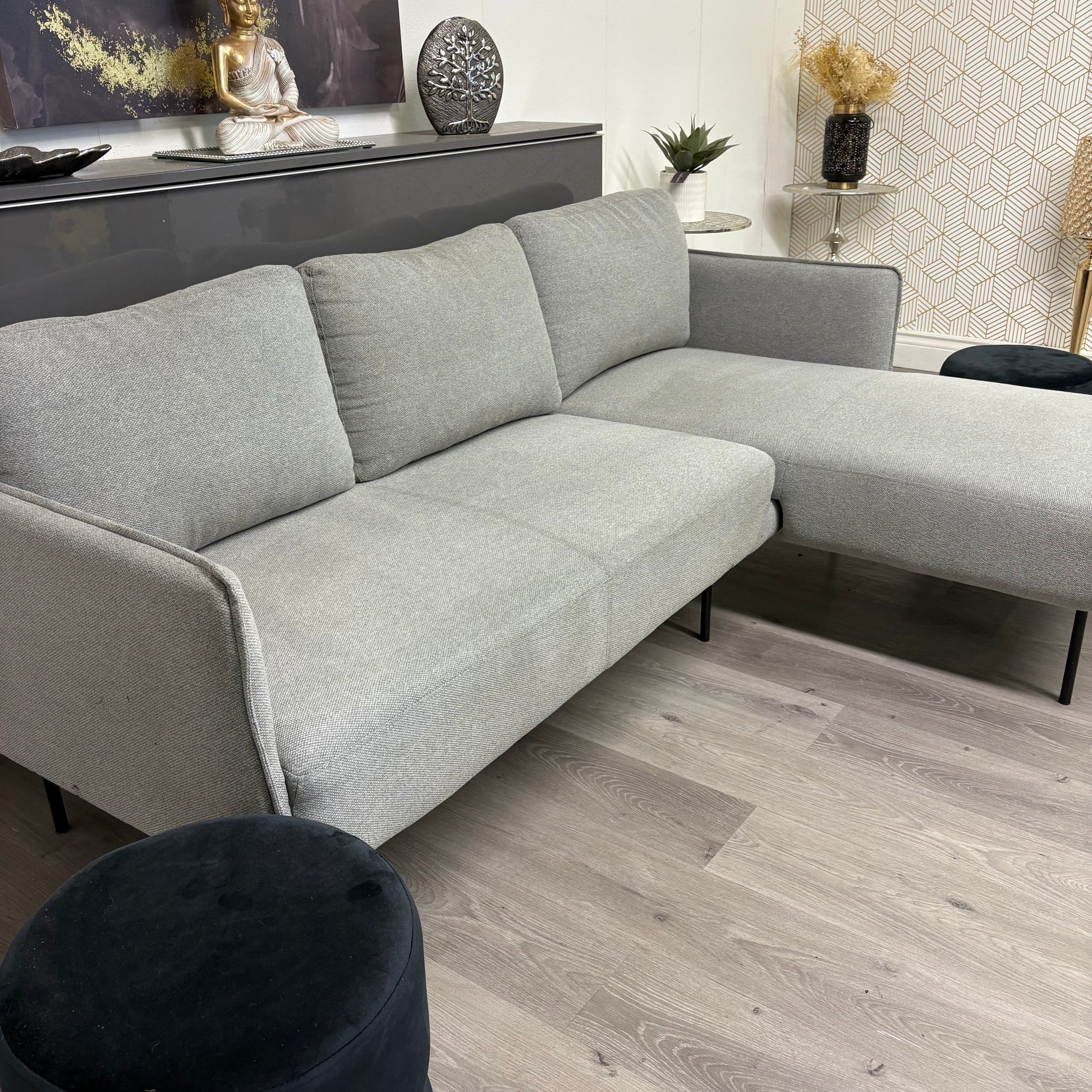 Canapé sectionnel, en excellent état comme neuf, au design moderne et épuré. Revêtu d’un tissu gris clair élégant et facile à agencer, il offre une assise confortable et bien soutenue, idéale pour un salon familial ou un espace de détente.